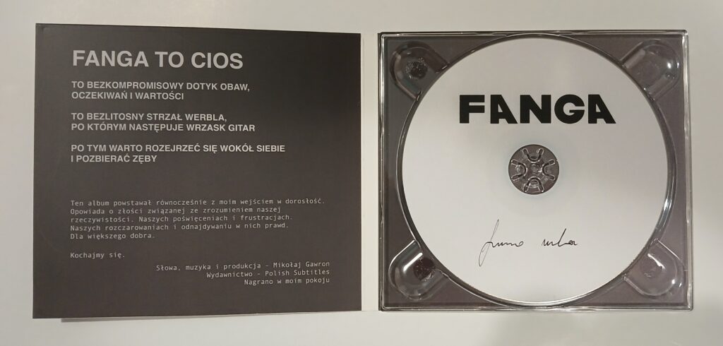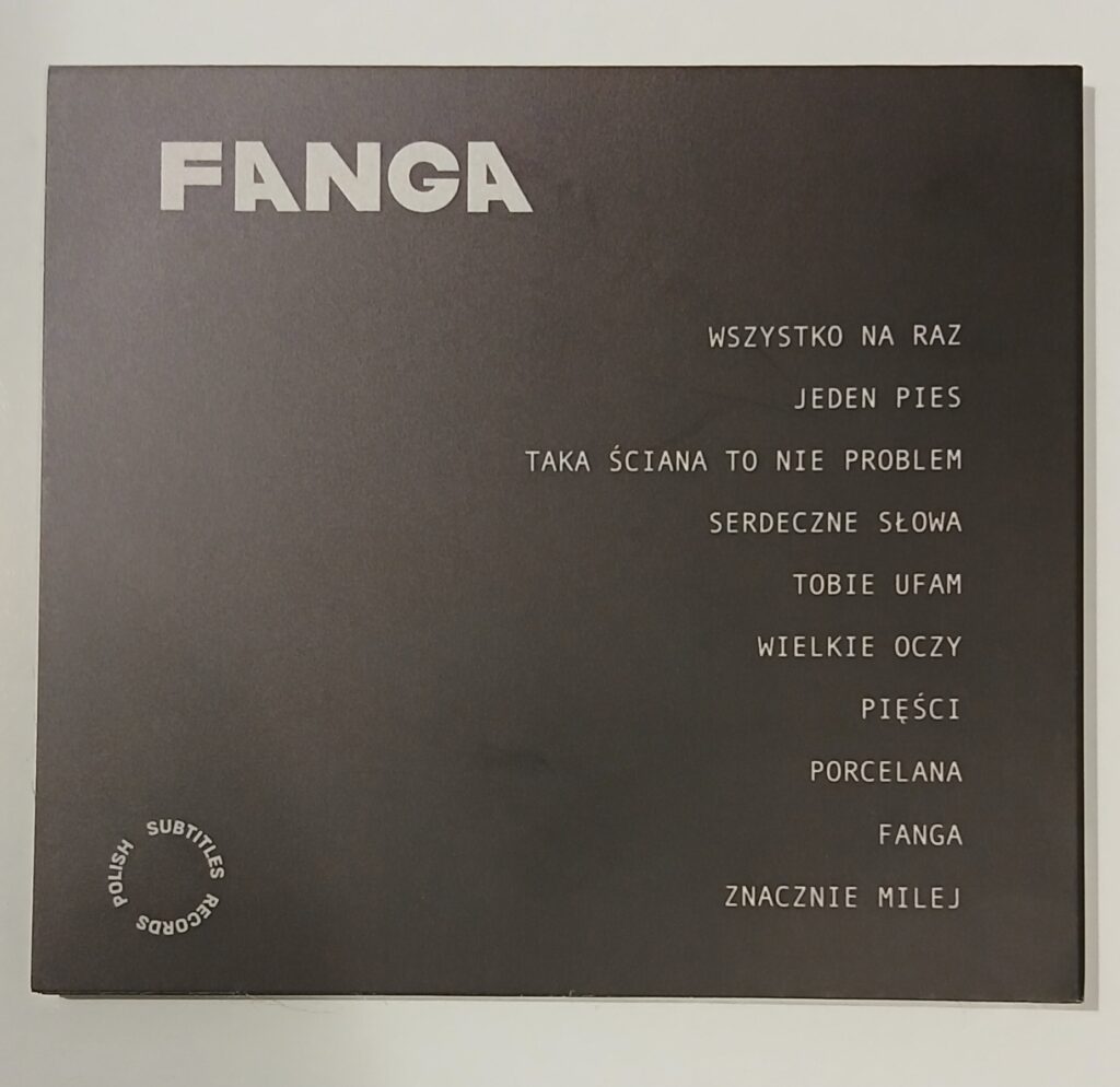 Jest to krzyk gościa z młodego pokolenia który okazuje się totalnie mocny i pozbawiony złudzeń. Taki numer jak ,,Serdeczne słowa” jest tego doskonałym przykładem…. ,,Pierwsze skrzypce grają dłonie i mój gniew…” Czy można dosadniej? Franio Mucha użył wszystkich środków przekazu do tego, żeby na tym albumie oddać swoją frustrację współczesnym światem, być może pokoleniem z którego pochodzi? W tekstach jest generowany niepokój, który tworzy klimat z którym słuchacz chce się zmierzyć. W dźwiękach dominuje siła post punkowych gitar, grunge’owego brudu i zarazem melodyjnego odniesienia do muzyki lat 90. Jakiej? Właśnie tej seattle’owej sceny jak choćby w ,,Tobie ufam”, gdzie słyszymy powiew klimatu dobrych kapel z sceny grunge. Wspomniany post punk to z kolei ,,Wielkie Oczy”, gdzie flow tego numeru napędzają gitarowe motywy tak charakterystyczne dla tego podwórka. Franio Mucha zdaje się być muzykiem wszechstronnym dobrze zaopatrzonym w narzędzia, które dają mu możliwość stworzenia klimatu za którym tęsknią tacy słuchacze jak ja, ludzie po czterdziestce. Zarazem daje młodemu pokoleniu z którego się wywodzi szansę na poznanie brzmienia genialnego, alternatywnego rockowego grania. Im dalej zagłębiałem się w ten album, tym bardziej stwierdzam, że obcuję z mistrzostwem alternatywnego grania i kolejne numery jak ,,Pięści” czy ,,Porcelana” utwierdzały mnie w tym przeświadczeniu. Nadeszła tytułowa ,,Fanga”. Bardzo nostalgiczna i chyba zbierająca w jedną całość to wszystko, co Mikołaj Gawron chciał przekazać na tym albumie zarówno w tekstowej jak i muzycznej stronie.